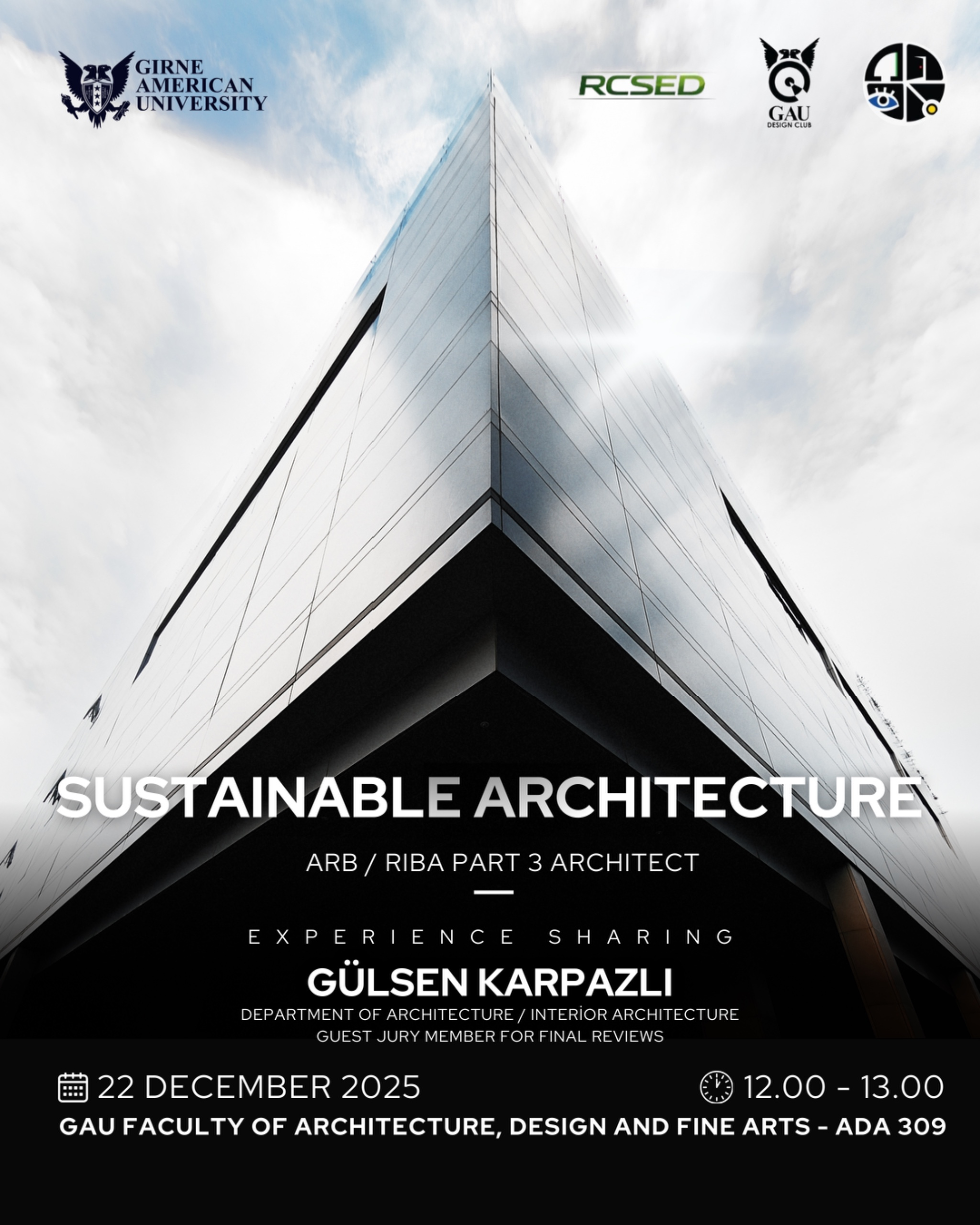 This event focuses on Sustainable Architecture, featuring an experience-sharing session with Gülsen Karpazlı. The talk will explore sustainability principles in architectural practice, real-world applications, and professional insights relevant to architecture and interior architecture students. The session aims to encourage environmentally responsible design approaches and knowledge exchange within the academic community.