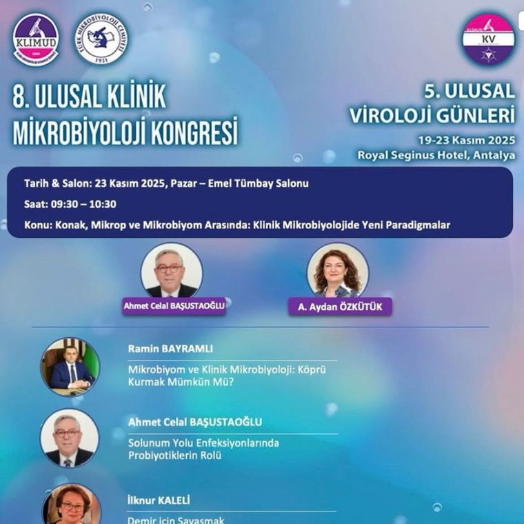 Prof. Dr. Ahmet Celal Başustaoglu, Dean of the Faculty of Medicine, represented Girne American University at the 8th National Clinical Microbiology Congress held in Antalya, presenting on the role of probiotics in respiratory tract infections.