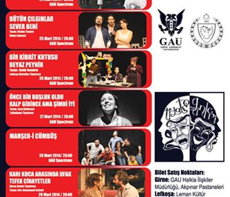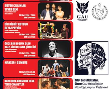 The plays which are organized under the GAU 1st Theater Days with the cooperation of TRNC Deputy Prime Minister and the GAU Acting - Drama Department as part of the 27th March World Theatre Days, will be staged at 20:00 pm every night between the dates of 24th and 30th of March for the enjoyment of theatre lovers.
