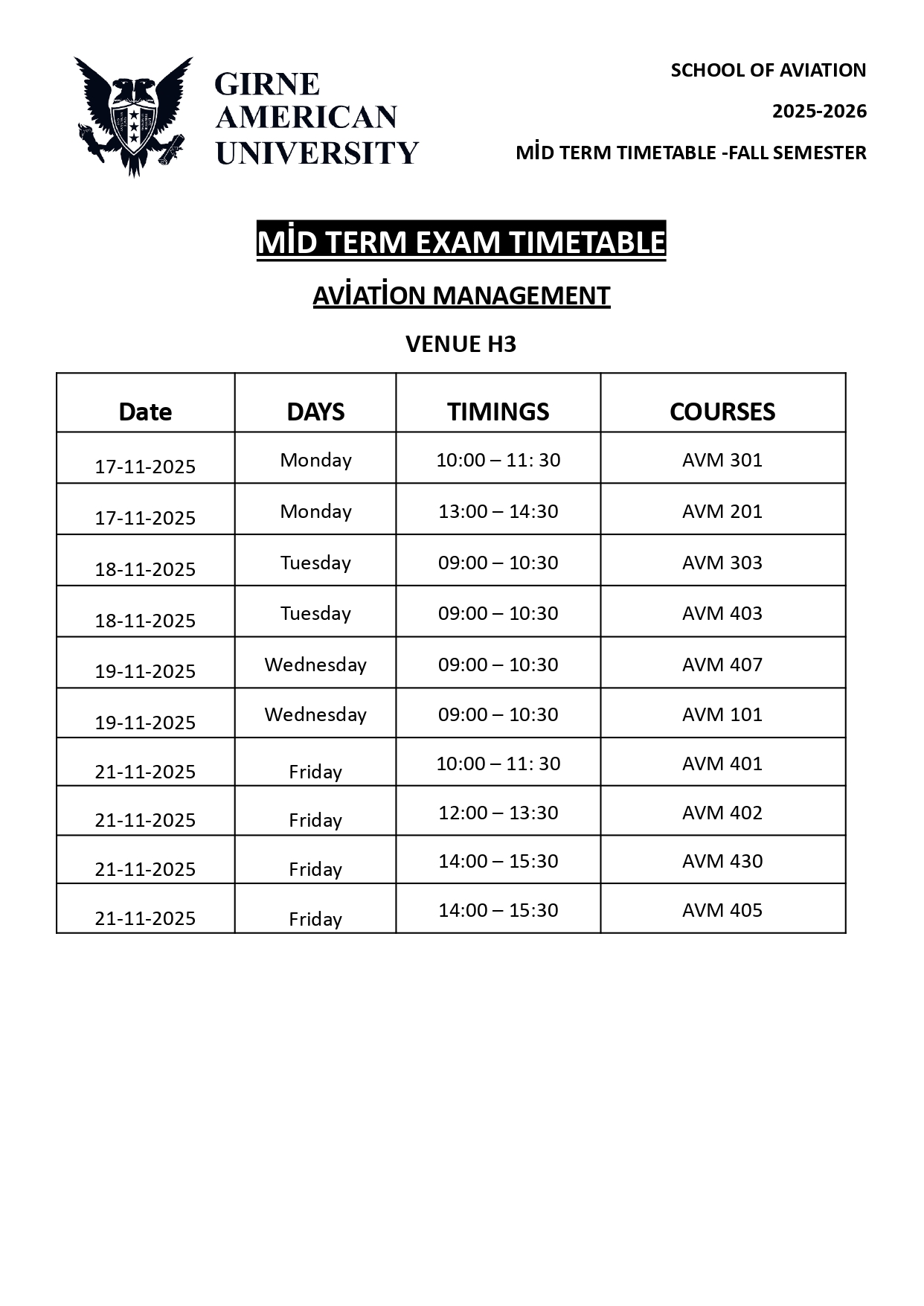 Please be informed that the Mid-Term Examinations for the Aviation Management program will be held as per the schedule below.