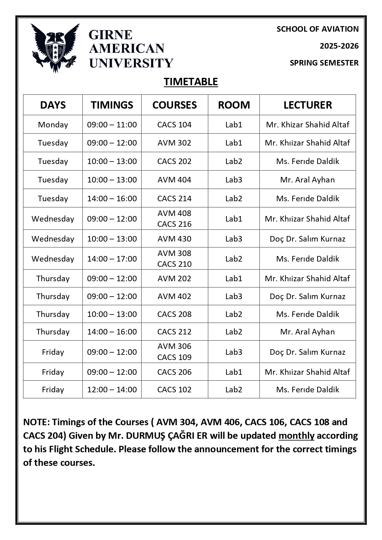 Timings of the Courses ( AVM 304, AVM 406, CACS 106, CACS 108 and CACS 204) Given by Mr. DURMUŞ ÇAĞRI ER will be updated Monthly according to his Flight Schedule.
