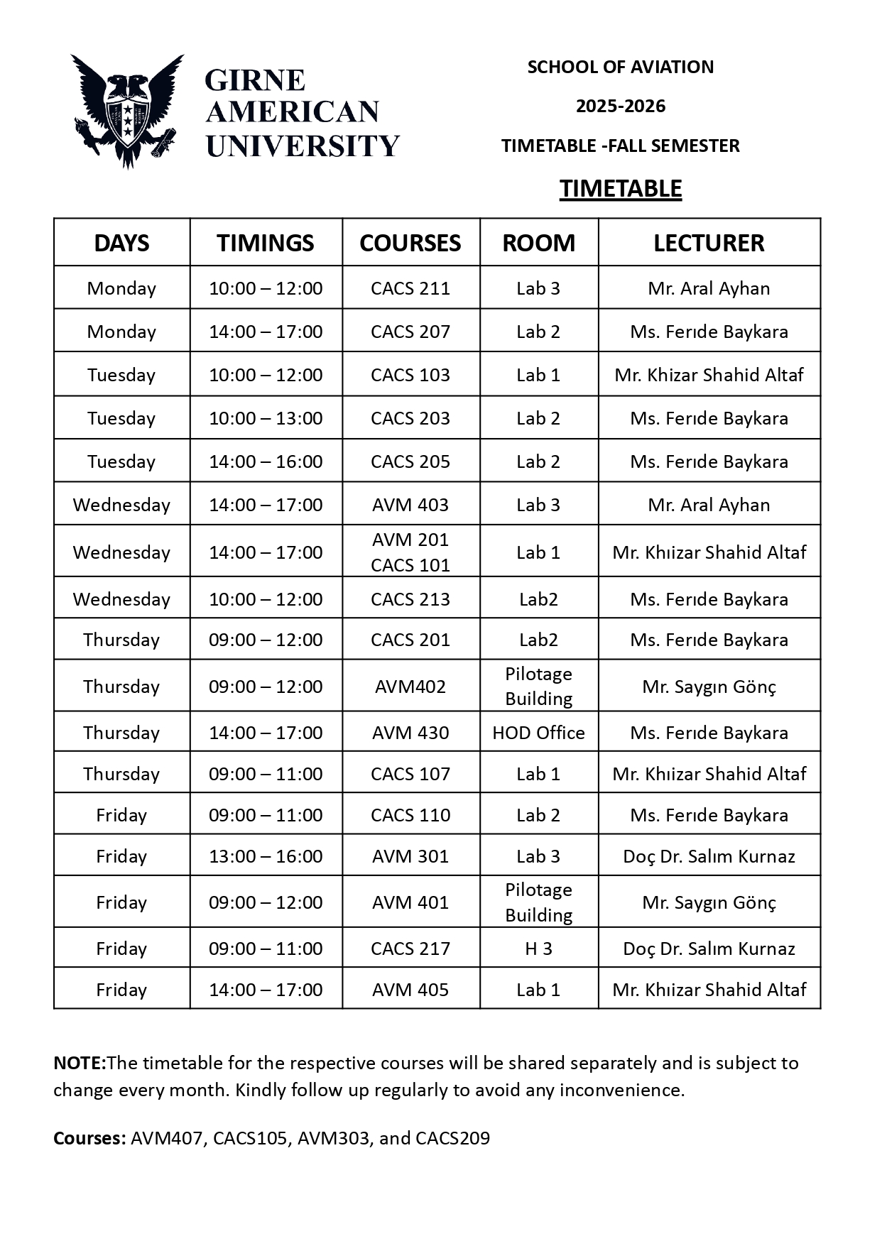 AVM303, AVM407, CACS105, and CACS209 will be updated monthly based on the flight schedule of Captain Durmuş Çağrı ER.