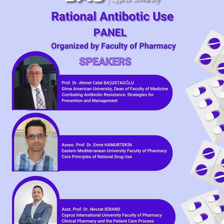Bahçeşehir Kıbrıs Üniversitesi Eczacılık Fakültesi tarafından düzenlenen Akılcı Antibiyotik Kullanımı Paneli'ne GAÜ'yü temsilen Prof. Dr. Ahmet Celal Başustaoğlu katıldı. Başustaoğlu, diğer seçkin uzmanlarla birlikte "Antibiyotik Direnciyle Mücadele: Önleme ve Yönetim Stratejileri" başlıklı bir konuşma yaparak, sorumlu antibiyotik uygulamalarının önemini vurguladı.