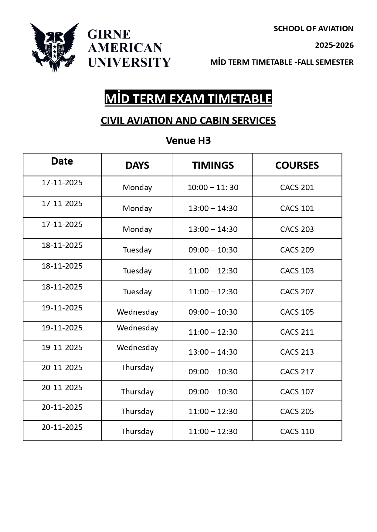 Sivil Havacılık ve Kabin Hizmetleri programı ara sınavlarının aşağıdaki programa göre yapılacağını bilgilerinize sunarız.