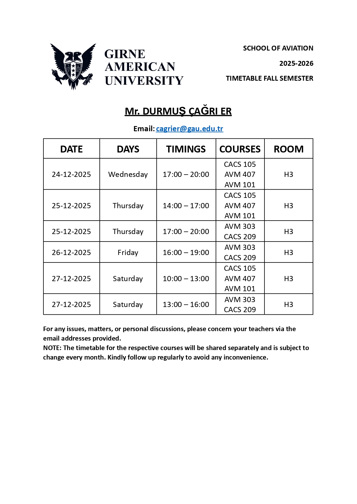 Aşağıda Aerodinamik ve Meteoroloji derslerinin (AVM407, CACS105, AVM101, AVM303, CACS209) Aralık ayı programı bulunmaktadır.