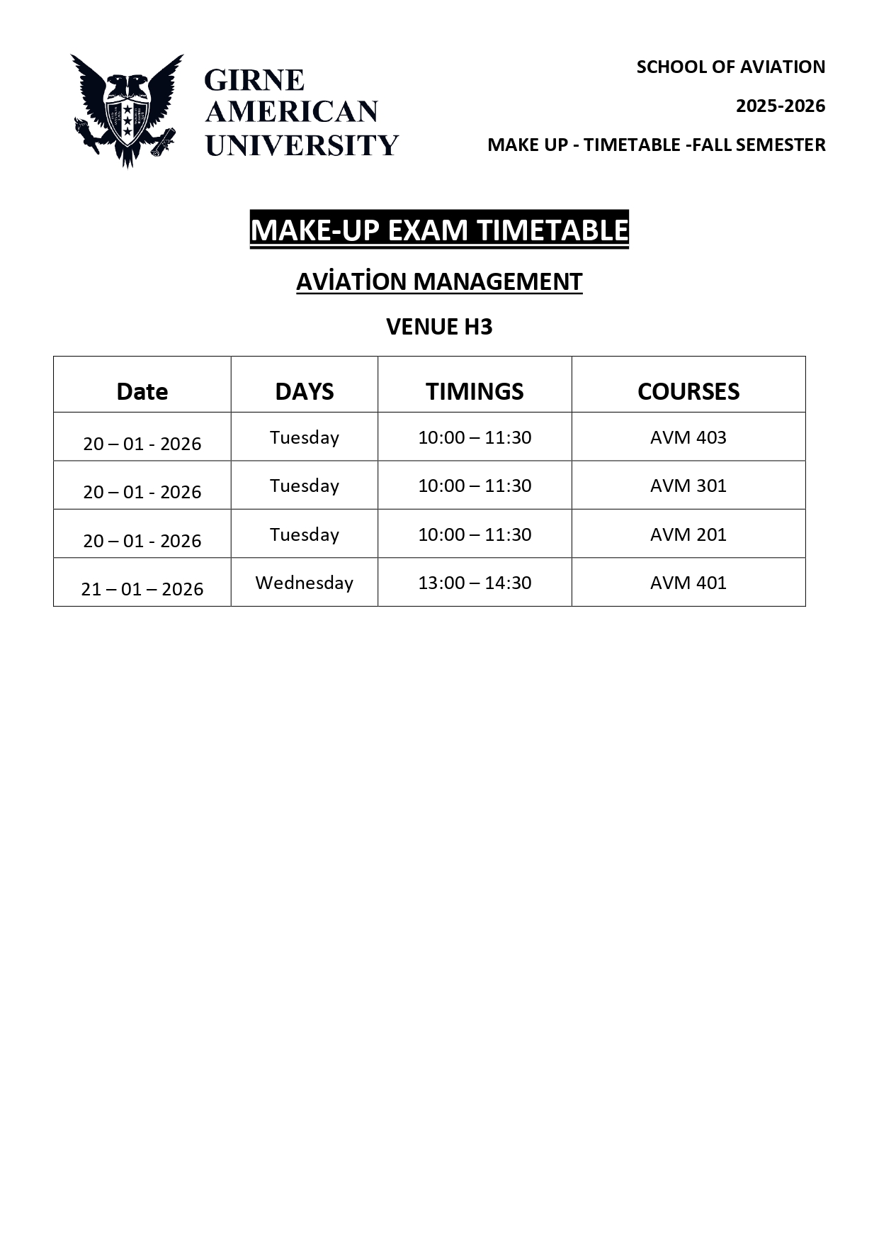 Please be informed that the Make-up Examinations for the Aviation Management program will be held as per the schedule below.