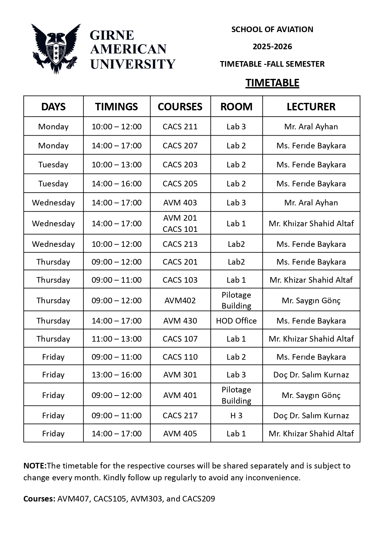 AVM303, AVM407, CACS105, and CACS209 will be updated monthly based on the flight schedule of Captain Durmuş Çağrı ER .