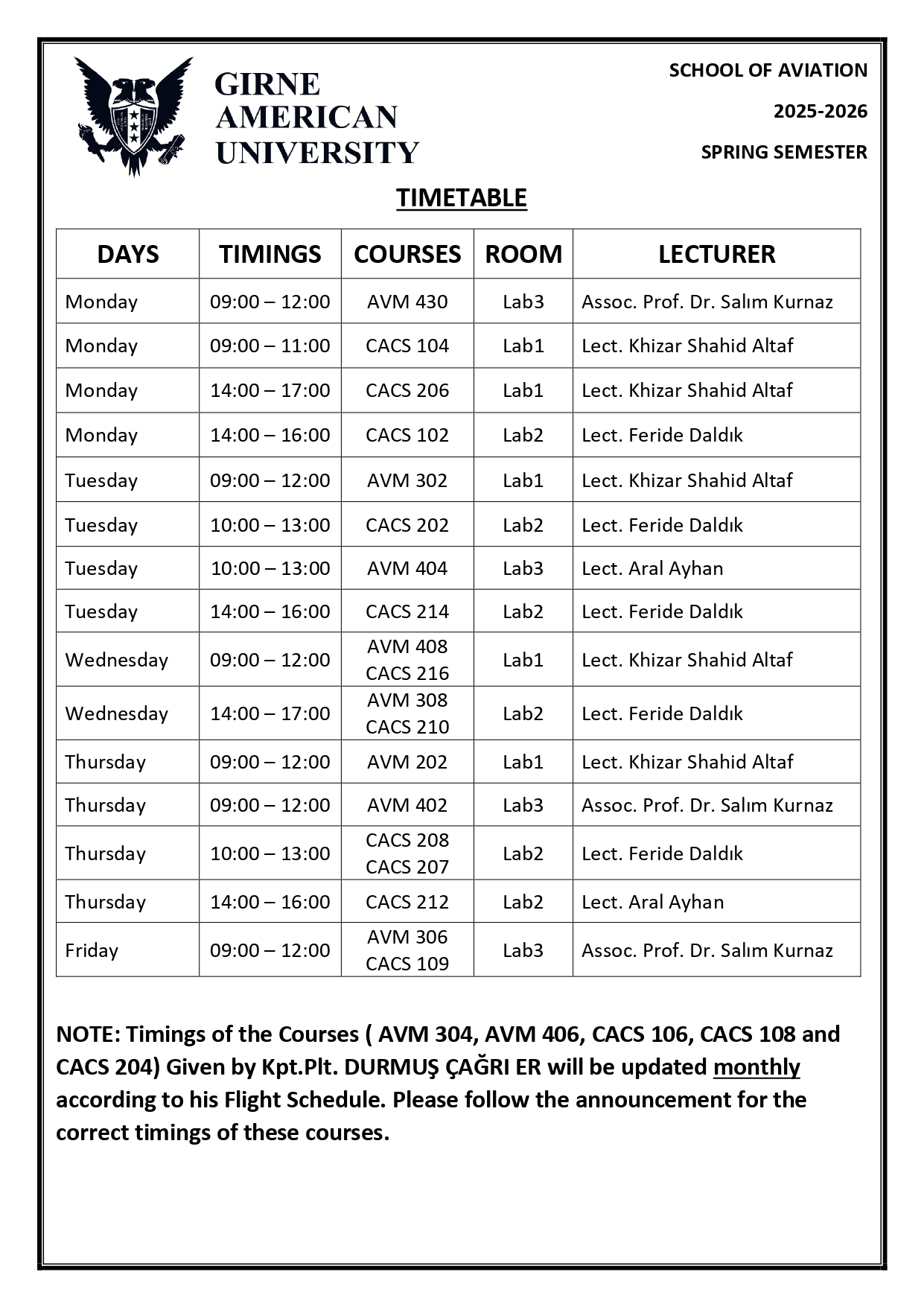 • Timings of the Courses ( AVM 304, AVM 406, CACS 106, CACS 108 and CACS 204) Given by Mr. DURMUŞ ÇAĞRI ER will be updated Monthly according to his Flight Schedule.