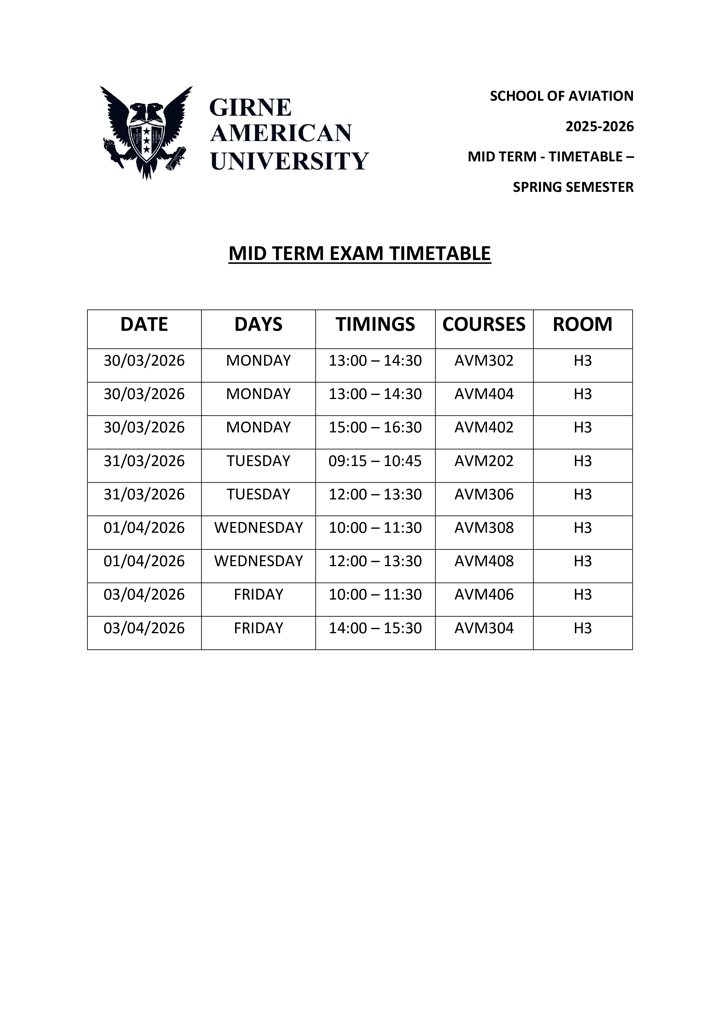 📢 Announcement: AVM 2025–2026 Spring Semester Midterm Exam Date and Time Update (26/03/2026)