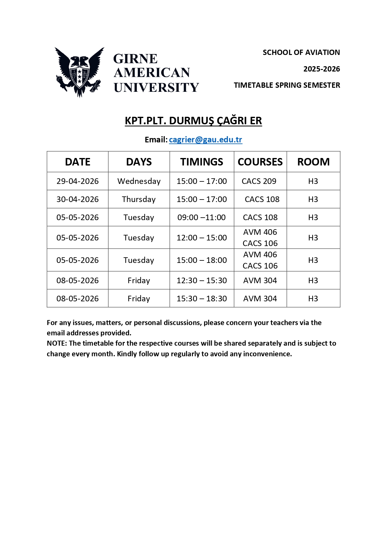 📢 ANNOUNCEMENT - Lecturer Durmuş Çağrı Er's Course Schedule (29/04/2026)