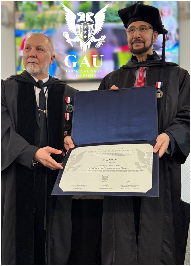 i itirazları sebebiyle gerçekleştirilememiştir. Bu olumsuz gelişmeye karşın; Girne Amerikan Üniversitesi, akademik bağımsızlığı ve evrensel değerleri temel alan duruşuyla, bu anlamlı takdimi İngiltere- Manchester’da gerçekleştirme kararı almıştır. Sayın Afzal Khan; Hukuk, yerel yönetimler, insan hakları, uluslararası diplomasi ve parlamenter siyaset alanlarında ortaya koyduğu örnek hizmetlerin yanı sıra, özellikle toplumsal barış, inançlar arası diyalog ve Filistin Davası-Gazze Savaşı sürecine yönelik insani duruşuyla da, uluslararası kamuoyunda büyük saygı görmektedir. Bu değerli şahsiyetin onurlandırılmasının, gecikmeksizin yapılabilmesi amacıyla da senato kararına uygun vecibe; Geçtiğimiz günlerde de Kurucu Rektörümüz ve Yöneticiler Kurulu Başkanı Sayın Serhat Akpınar’ın da bizzat eliyle, ilgili törende tevdi edilmiştir.” ifadeleri yer aldı.