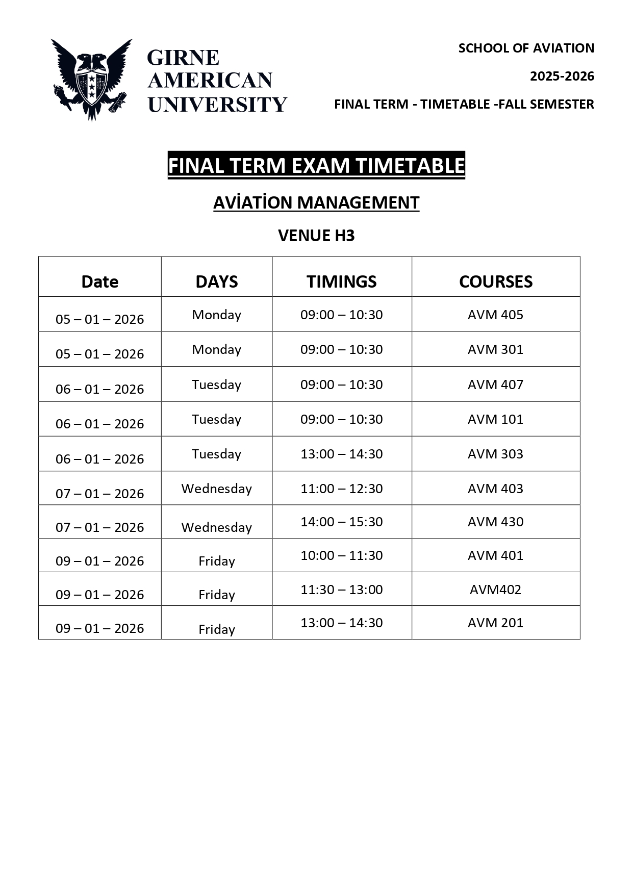 Havacılık Yönetimi programının dönem sonu sınavlarının aşağıdaki takvime göre yapılacağını bildiririz.