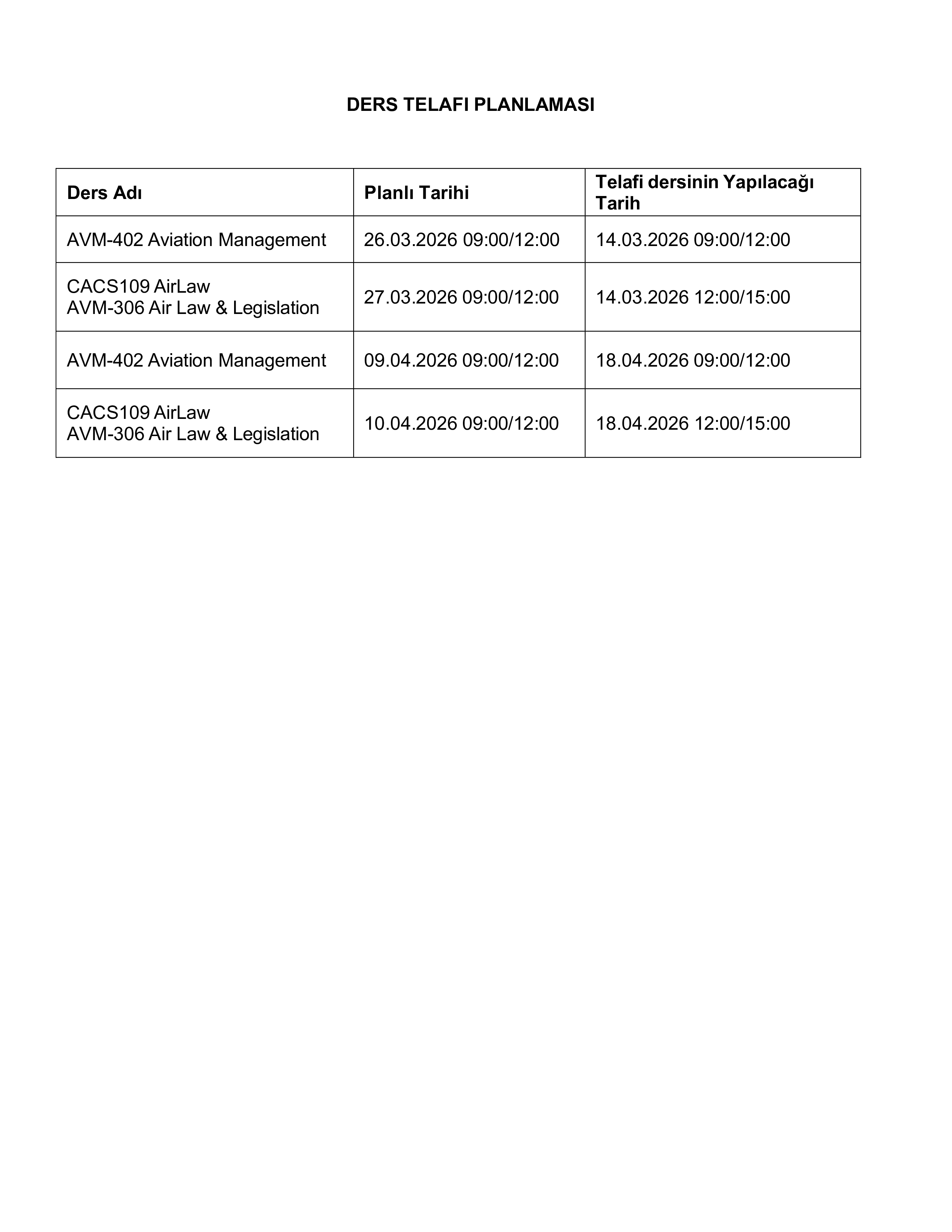 Yüksekokul müdürümüz Doç. Dr. Salim Kurnaz'ın izni sebebiyle aşağıdaki planlı dersler telafi dersi şeklinde güncellenen tarih ve saatlerde yapılacaktır.