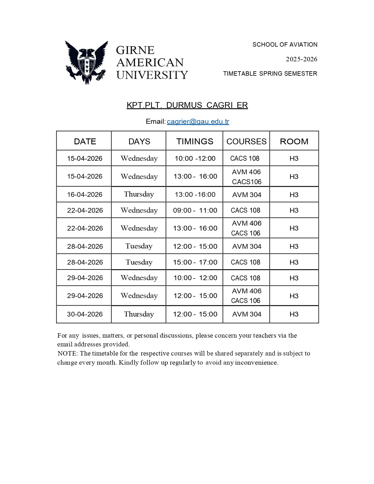 📢 DUYURU - Öğr. Gör. DURMUŞ ÇAĞRI ER NİSAN AYI DERS PROGRAMI (14/04/2026)