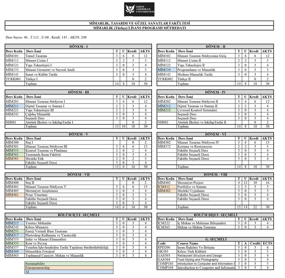 Tasarım mükemmeliyeti, teknolojik yetkinlik ve sürdürülebilirlik ilkeleri üzerine kurulu müfredat; öğrencilerde sanatsal ifade ile işlevsel, yaşam odaklı mimari çözümler arasında anlamlı bir denge kurmayı amaçlar. Program, estetik yargı geliştirme, analitik düşünme ve sosyal, çevresel ve ekonomik koşullara duyarlı problem çözme becerilerini destekler.