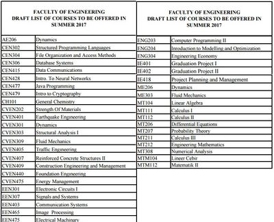 2016/2017 Yaz Okulunda Açılacak Ders Listesi Birinci Taslak